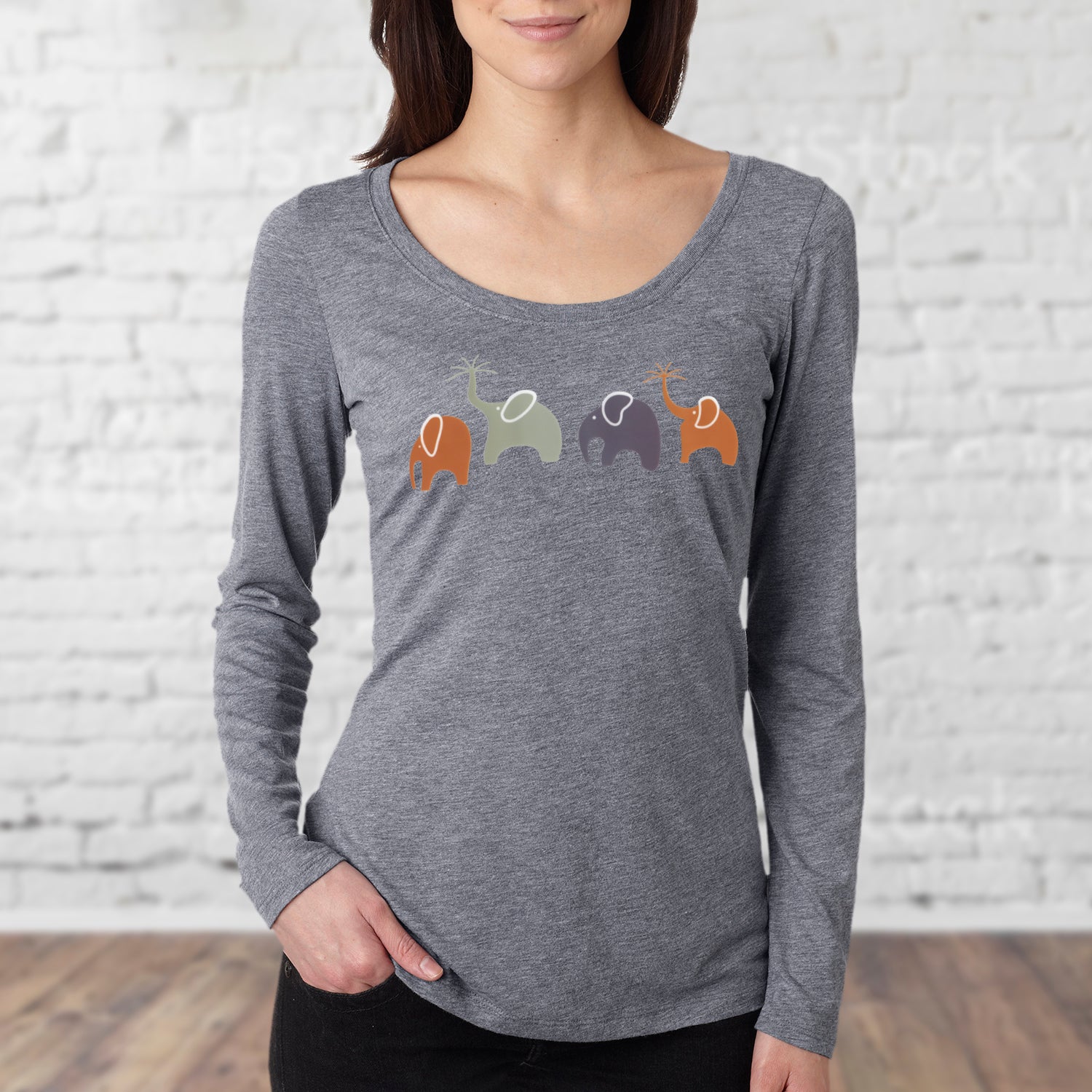 Elephant Shirt - Long-Sleeve Scoop Neck "Happy Family" - Grey